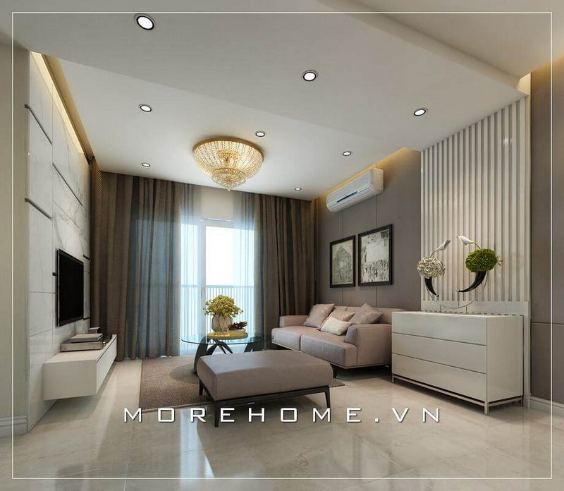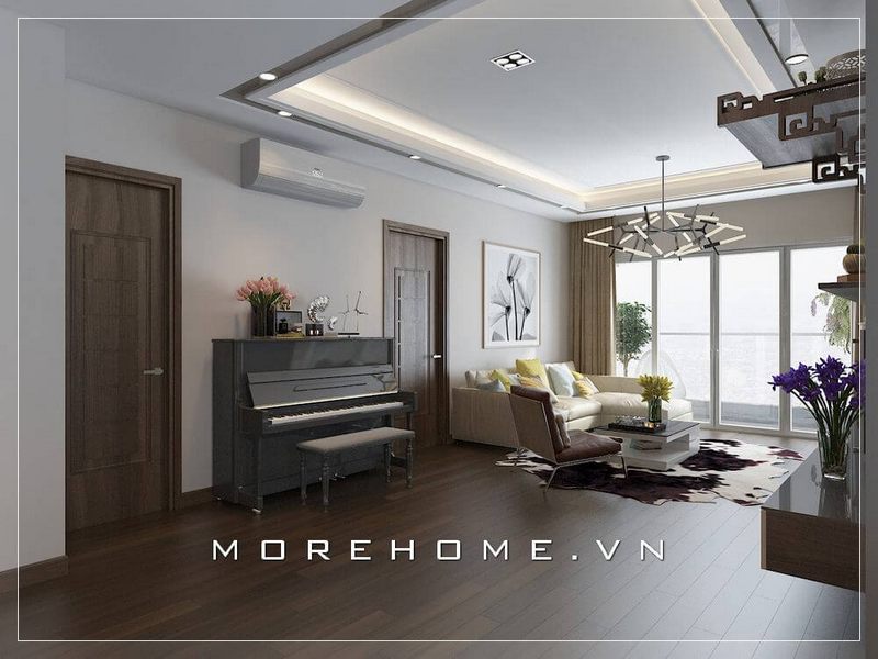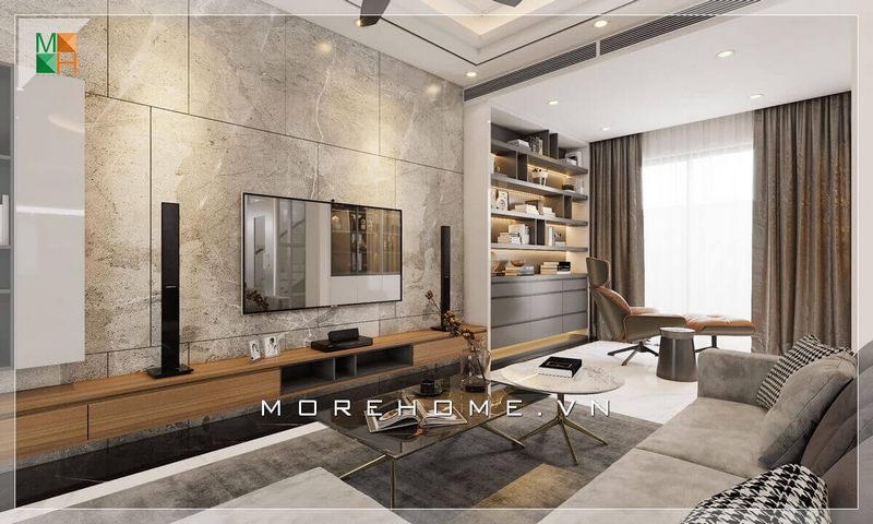 Thiết kế phòng khách nhấn mạnh đến sự tối giản, KTS Morehome sử dụng hầu hết các chi tiết trang trí và các vật dụng hiện đại, không đi sâu vào các chi tiết nhỏ giúp không gian trở nên gọn gàng, tinh tế hơn