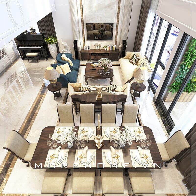 Bố trí nội thất phòng khách tân cổ điển sang trọng, đường nét hoa văn chạm khắc tinh tế tạo nên không gian căn phòng