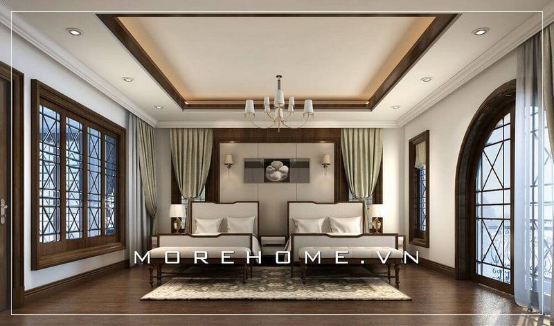 Thiết kế nội thất giường ngủ gỗ óc chó tự nhiên sang trọng tại biệt thự Hà Nội phong cách hiện đại, trẻ trung