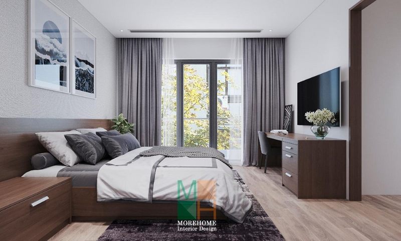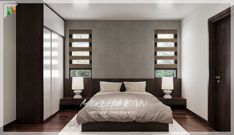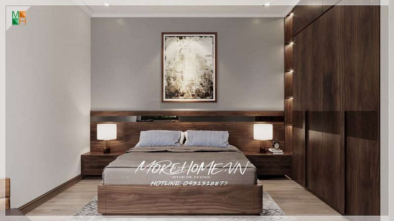 Thiết kế giường ngủ chung cư hiện đại, chất liệu gỗ óc chó với màu nâu trầm ấm, đường vân độc đáo mang đến không gian nghỉ ngơi sang trọng và tiện nghi nhất
