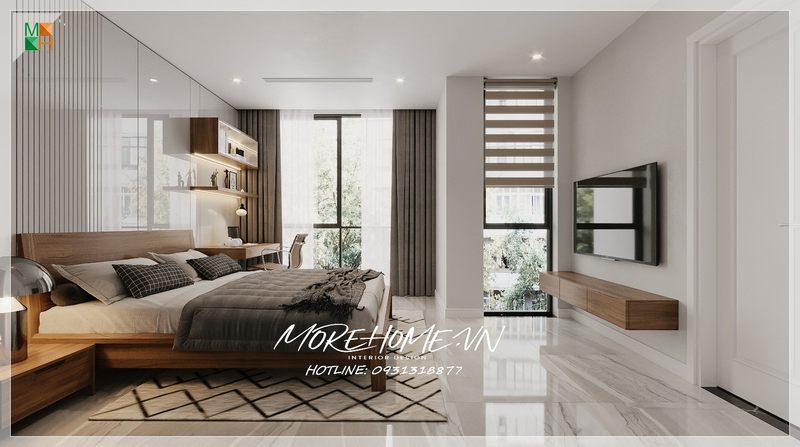 Giường ngủ được đặt chính giữa căn phòng với chất liệu bằng gỗ sang trọng hiện đại tạo cho không gian phòng ngủ nhà phố có thẩm mỹ hiện đại.