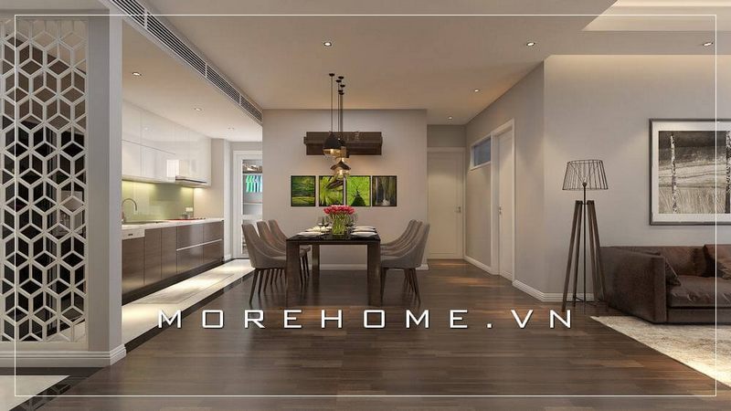 Thiết kế nội thất phòng bếp chung cư hiện đại, kết hợp ánh sáng tự nhiên giúp không gian căn phòng sáng và thoáng mát hơn