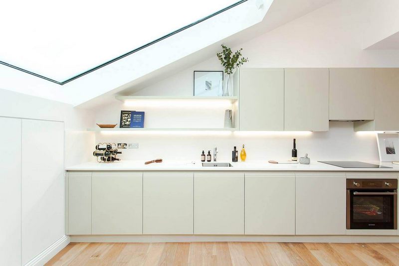 Trang trí chung cư với tủ bếp hiện đại màu trắng, tường bếp được ốp kính bếp màu cốm vàng MG-018 cao cấp làm điểm nhấn nổi bật cho căn nhà