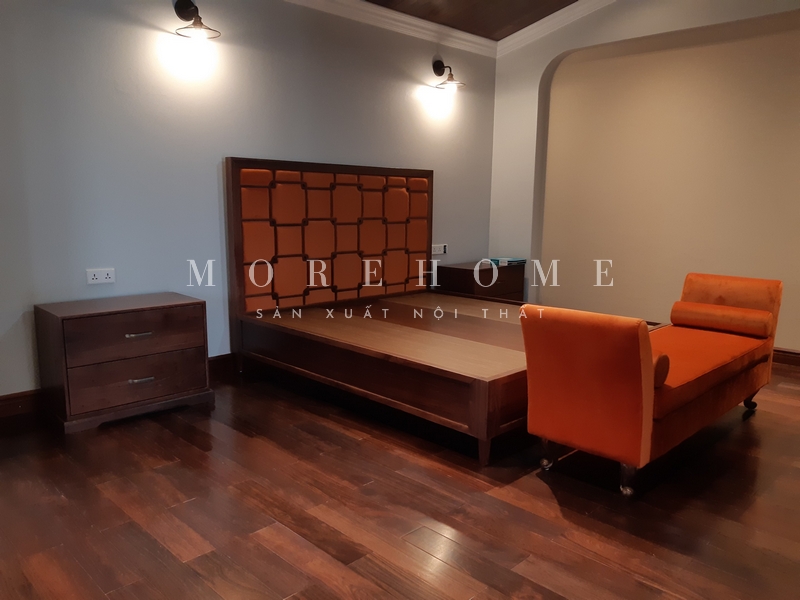 Giường gỗ tân cổ điển với tone màu sành điệu, từng đường nét hoa văn điêu khắc vô cùng tinh xảo, chiếc đôn sofa cùng chất liệu được bố trí ở phía cuối giường tạo cho gia chủ có một không gian riêng tư sang trọng, gọn gàng và ngăn nắp hơn