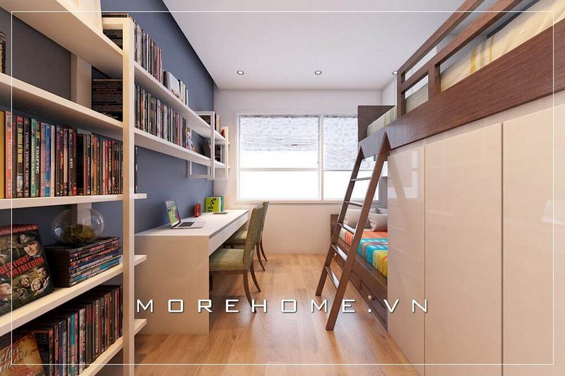 Thiết kế phòng ngủ con có bàn học với cửa kính giúp không gian phòng ngủ trở nên sang, thoáng mát. Đồng thời điều hòa không khí mang đến sự trong lánh, sáng sủa và khô ráo cho căn phòng.