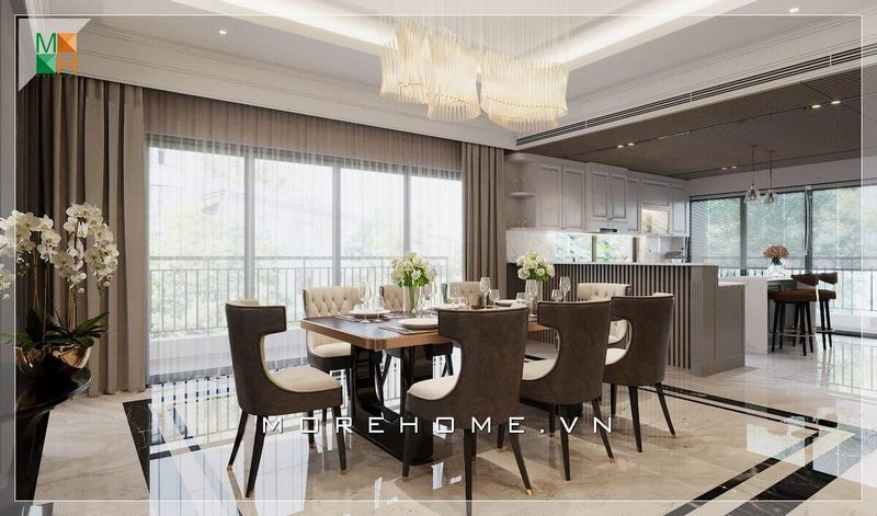 Thiết kế phòng ăn và phòng bếp liền kề nhau, bàn ăn được đặt giữa không gian thiết kế khá đơn giản với 6 chiêc ghế Grance bọc nệm và chiếc bàn với mặt bàn được làm bằng đá nhân tạo Ơđẹp mắt| ấn tượng}