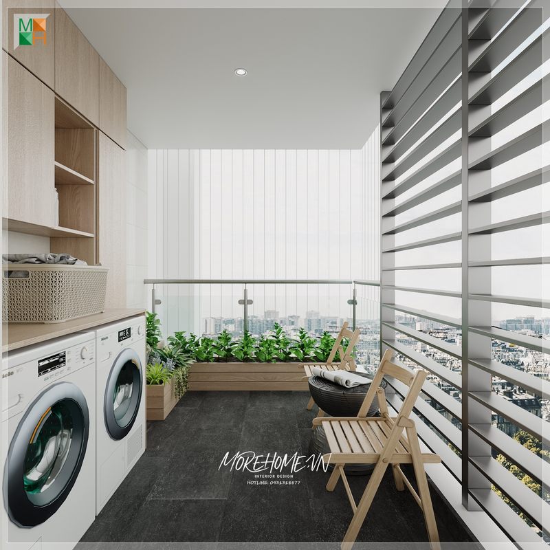 Mẫu logia cho chung cư, nhà phố nhỏ gọn được bố trí để máy giặt, máy sấy và trồng vài chậu cây xanh nhỏ