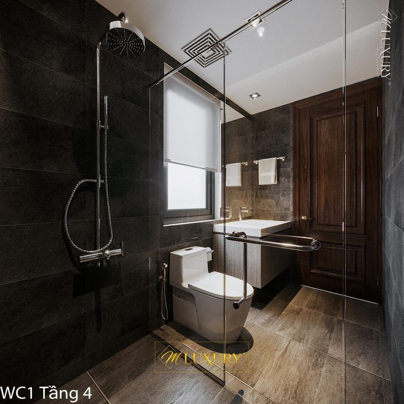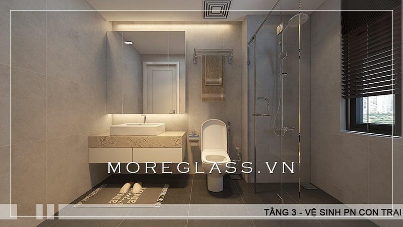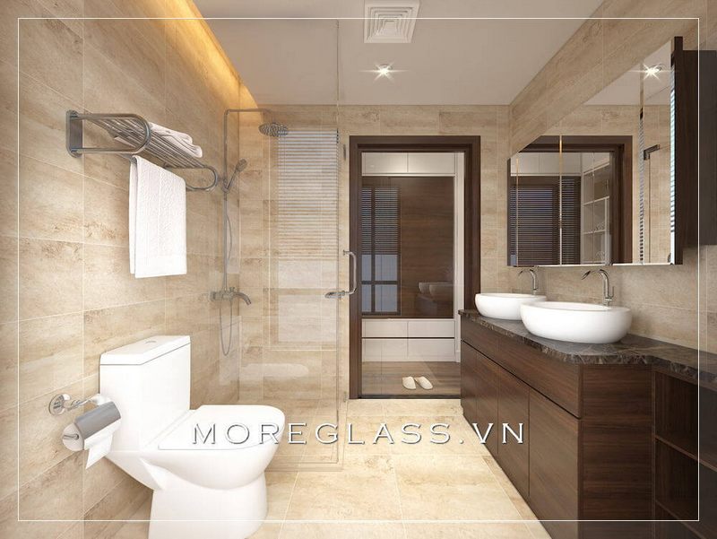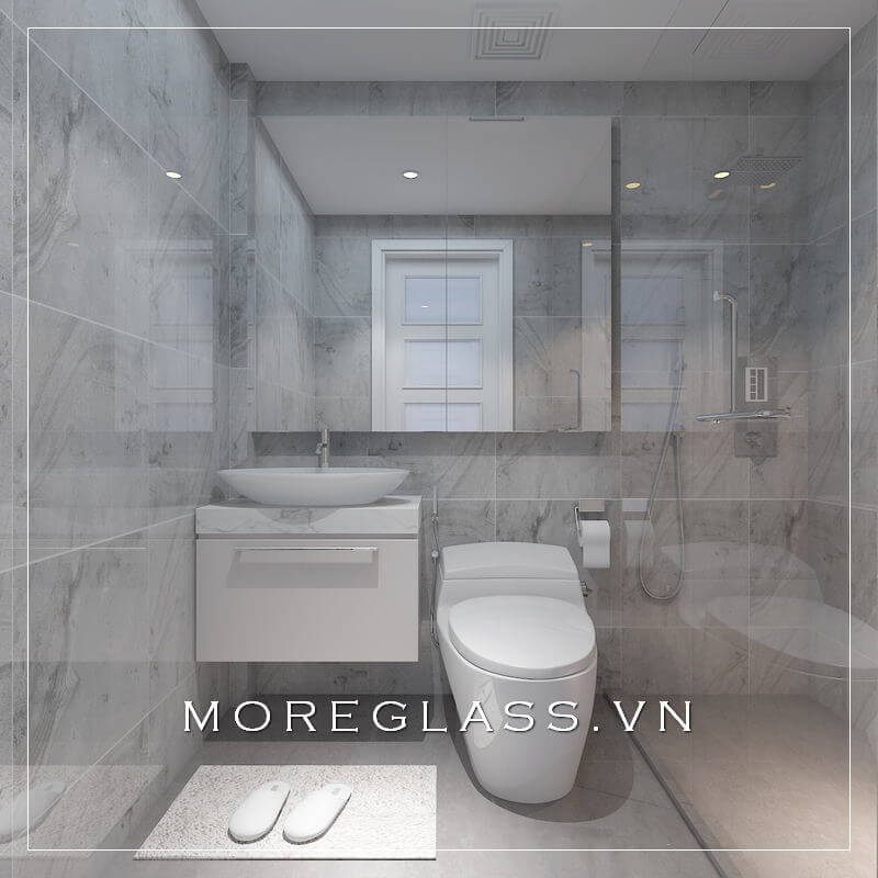 Mẫu thiết kế nhà vệ sinh hiện đại của chung cư đã kết hợp với phòng tắm kính cường lực cao cấp, giúp tạo ra không gian tiện nghi và thoải mái mà không bị chật trội.
