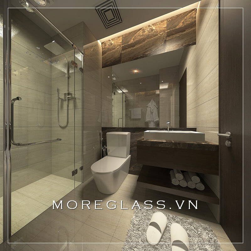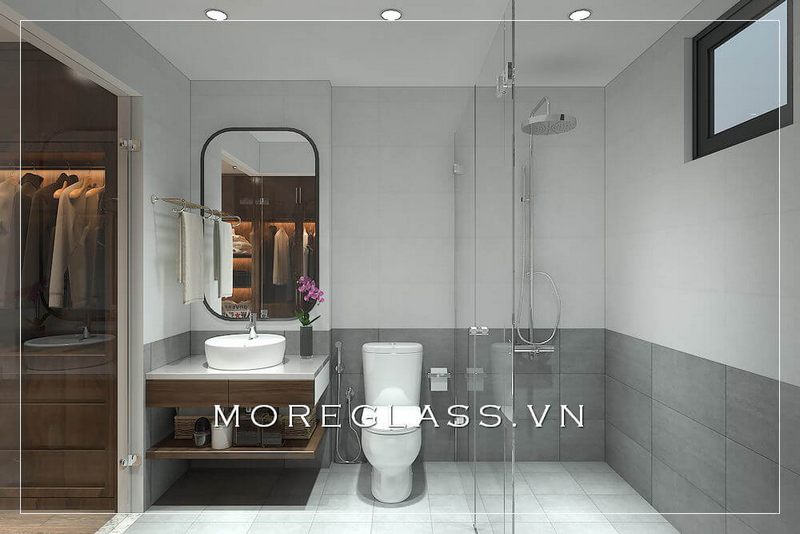 Mẫu thiết kế của nhà tắm và nhà vệ sinh sử dụng kính cường lực để tạo nên vẻ đẹp tinh tế và sang trọng.
