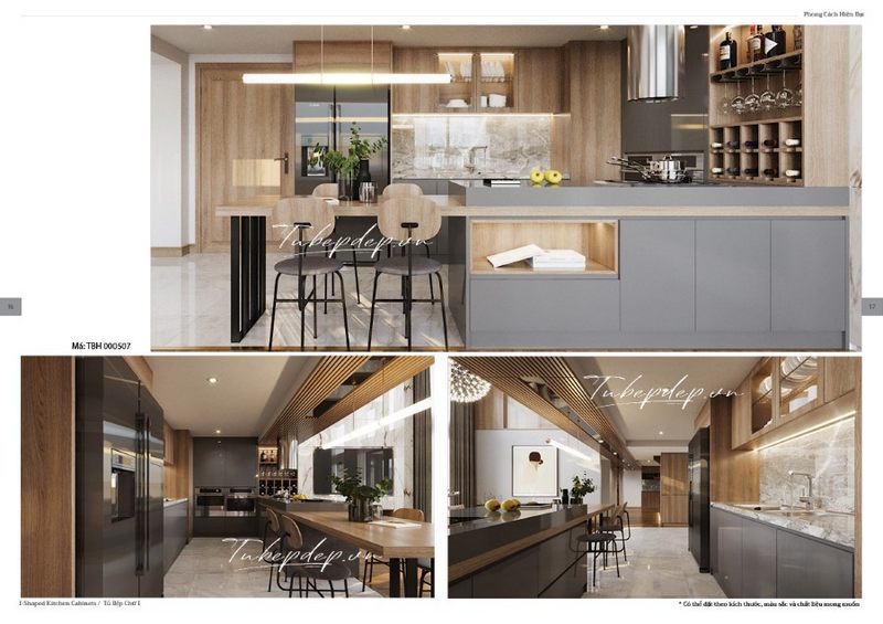 Nội thất phòng bếp biệt thự, nhà phố được thiết kế linh hoạt bằng cách sử dụng đá gỗ, tạo nên một cảnh quan sang trọng và ấn tượng.